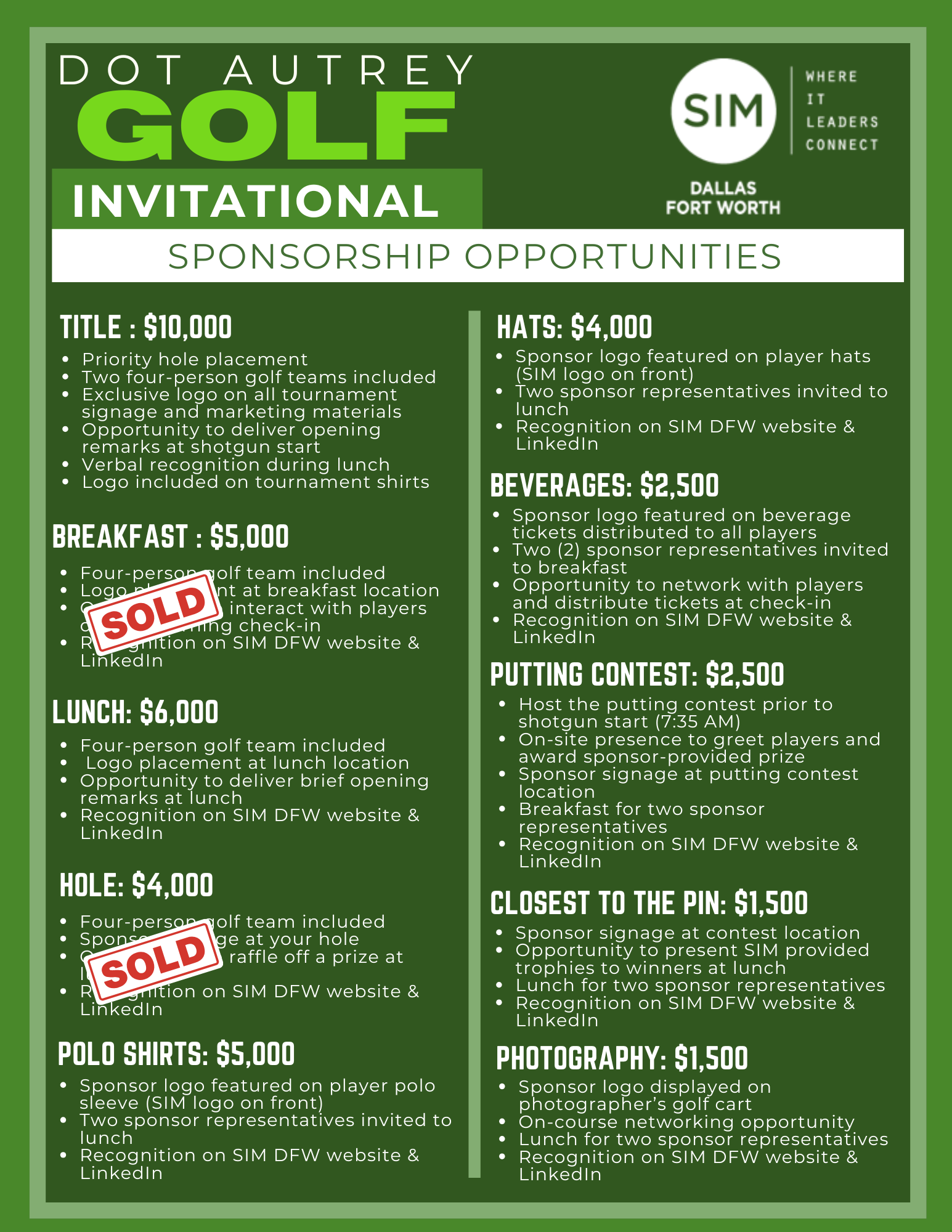The Dallas Fort Worth Chapter of Society for Information Management invites you to join us on the golf course for our Annual Dot Autrey Golf Invitational. This tournament provides our members a fun opportunity to network and support our mission to Connect, Grow and Give Back to the current and future IT community.